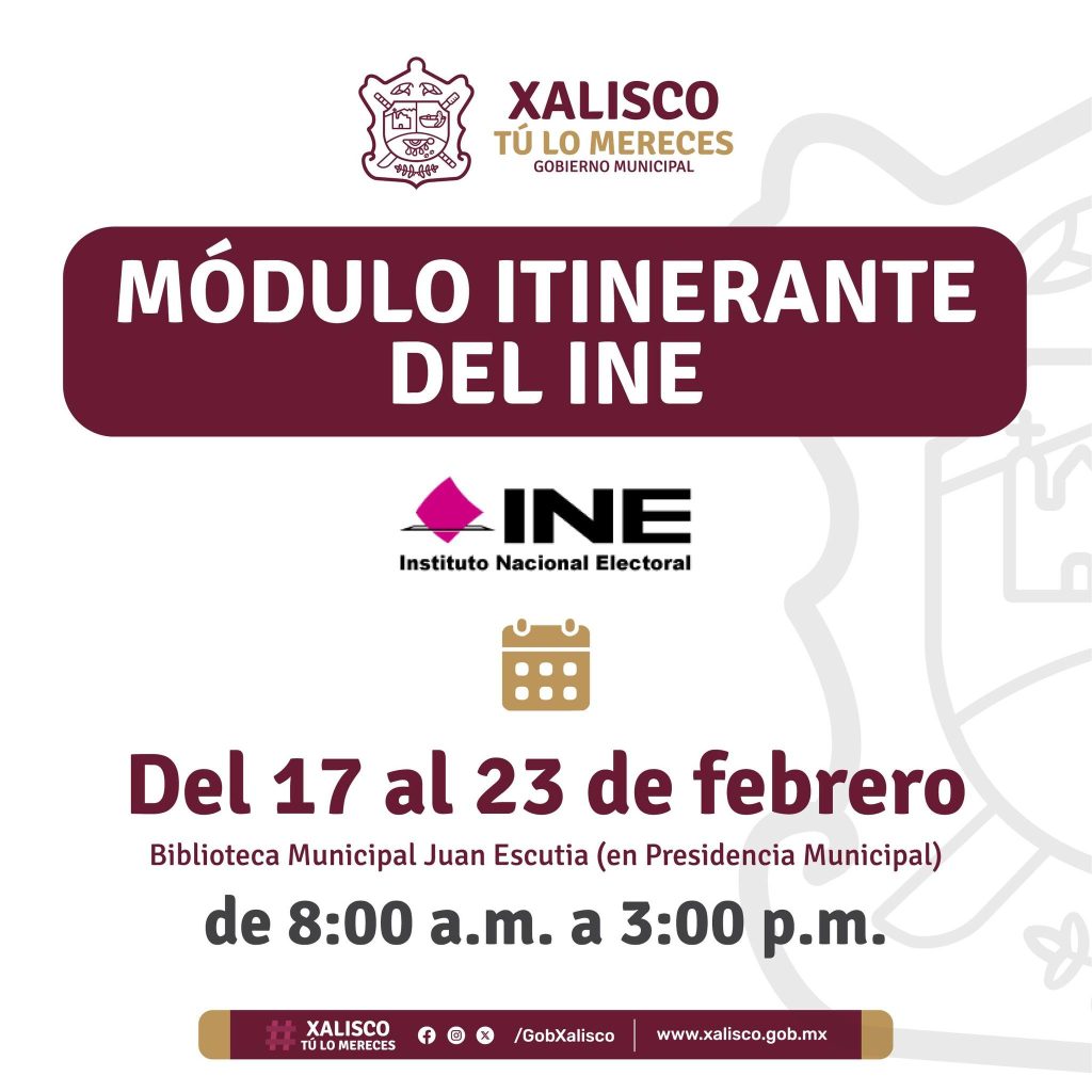 Del 17 al 23 de febrero el módulo del INE brindará atención a la ciudadanía en la biblioteca Juan Escutia de la Presidencia Municipal.
