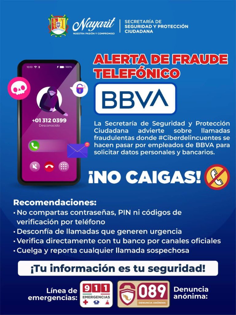 La Secretaría de Seguridad y Protección Ciudadana advierte sobre llamadas fraudulentas donde #Ciberdelincuentes se hacen pasar por empleados de establecimientos bancarios para solicitar datos personales y bancarios.