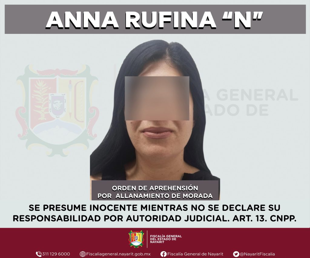 Elementos de la Agencia de Investigación Criminal de Nayarit ejecutaron una orden de aprehensión en la localidad Las Varas, municipio de Compostela contra Anna Rufina “N”, por su presumible participación en hechos que la ley considera como delito de allanamiento de morada, cometido en agravio de una mujer cuya identidad es reservada para salvaguardar su privacidad.