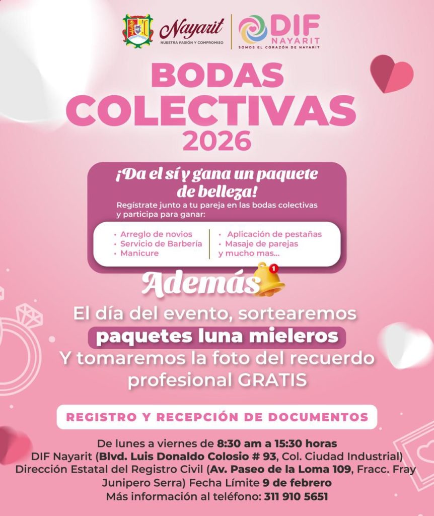 El Gobierno del Estado y el Sistema DIF Nayarit invitan a las parejas a formalizar su amor en las Bodas Colectivas 2026, un día para celebrar la unión y comenzar una nueva etapa juntos.