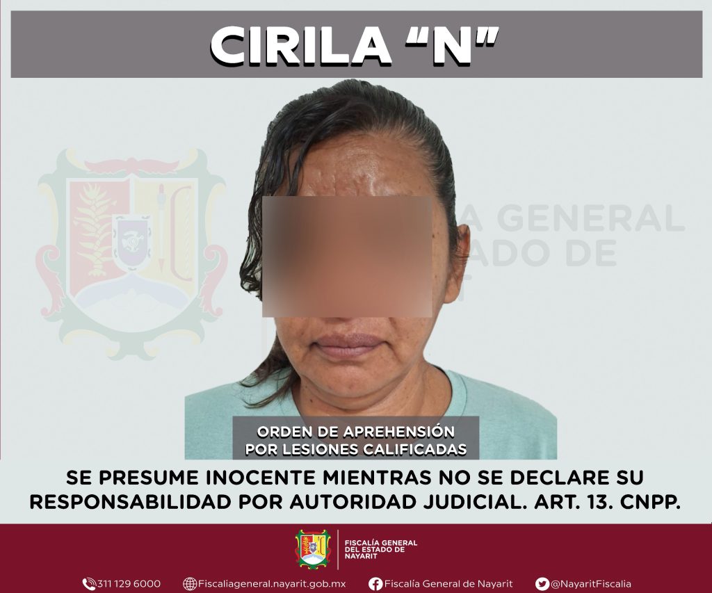 Elementos de la Agencia de Investigación Criminal de Nayarit ejecutaron una orden de aprehensión en el municipio de Acaponeta contra Cirila “N”, por su probable participación en hechos que para la ley configuran el delito de lesiones calificadas, cometido en agravio de una persona de sexo femenino cuya identidad se reserva para salvaguardar su privacidad e integridad.
