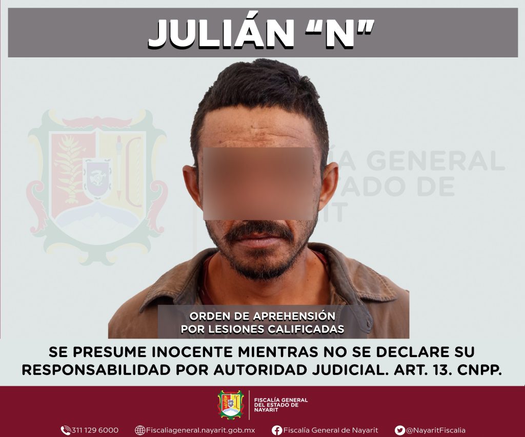 Elementos de la Agencia de Investigación Criminal de Nayarit ejecutaron una orden de aprehensión en el municipio de Amatlán de Cañas contra Julián “N”, por su probable participación en hechos que para la ley configuran el delito de lesiones calificadas, cometido en agravio de una persona de sexo masculino cuya identidad se reserva para salvaguardar su privacidad e integridad.