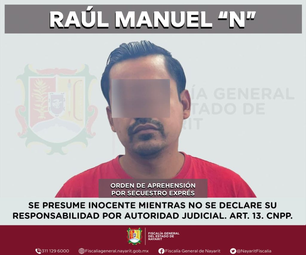 La Fiscalía General del estado de Nayarit informa que elementos de la Agencia de Investigación Criminal ejecutaron una orden de aprehensión en la ciudad de Tepic contra Raúl Manuel “N”, por su probable participación en hechos que la ley tipifica como delito de secuestro exprés, cometido en agravio de dos personas cuyas identidades se reservan con el propósito de salvaguardar su privacidad e integridad.