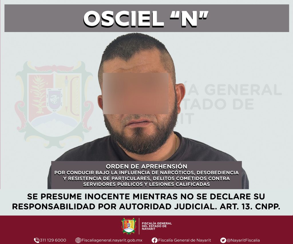 La Fiscalía General de Nayarit a través de la Agencia de Investigación Criminal ejecutó una orden de aprehensión en la localidad San Lorenzo, municipio de Ruiz contra Osciel “N”, por su probable participación en hechos que para la ley configuran los delitos de tránsito ejecutado por conductores de vehículos en su modalidad de conducir bajo la influencia de narcóticos o sustancias tóxicas, desobediencia y resistencia de particulares, delitos cometidos contra servidores públicos y lesiones calificadas.