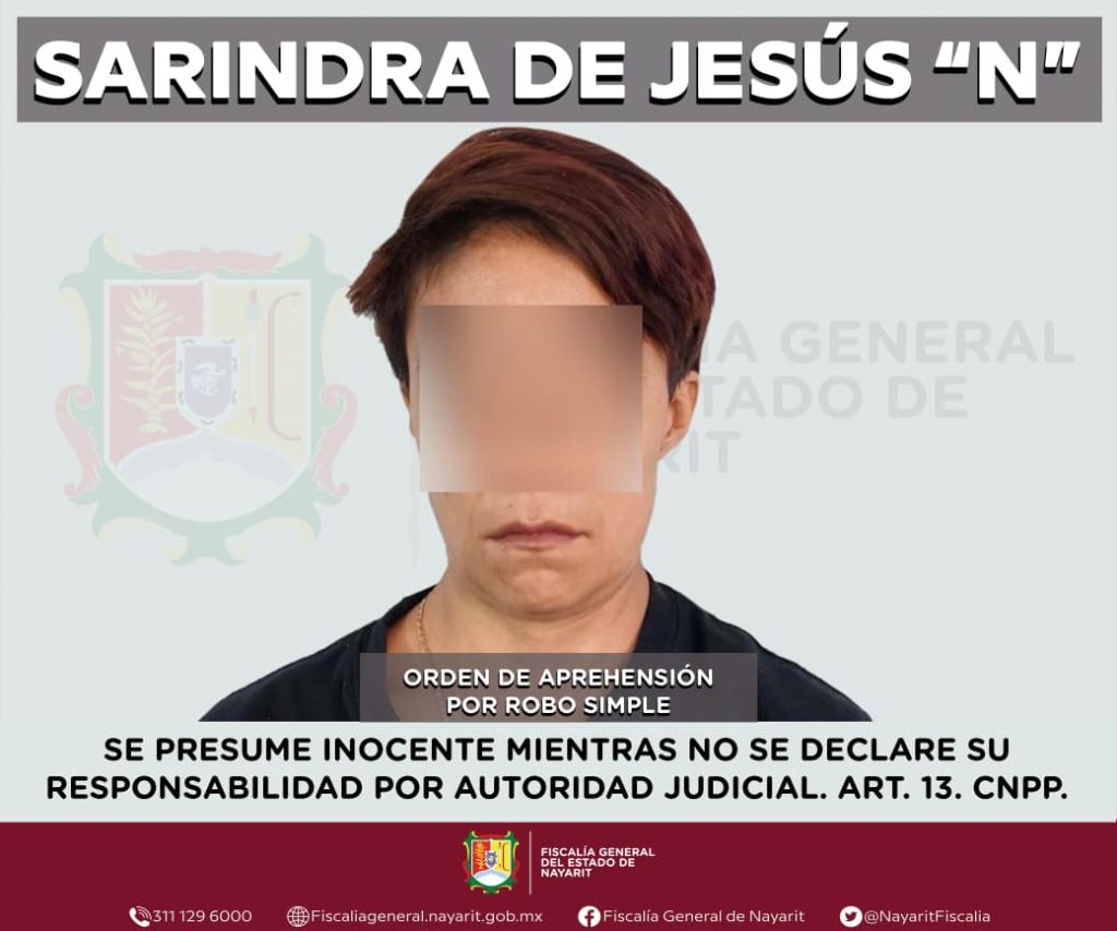 La Fiscalía General del estado de Nayarit informa que elementos de la Agencia de Investigación Criminal ejecutaron una orden de aprehensión en la ciudad de Tepic contra Sarindra de Jesús “N”, por su probable participación en hechos que la ley tipifica como delito de robo simple, cometido en perjuicio de una mujer cuya identidad se reserva con el propósito de salvaguardar su privacidad e integridad.
