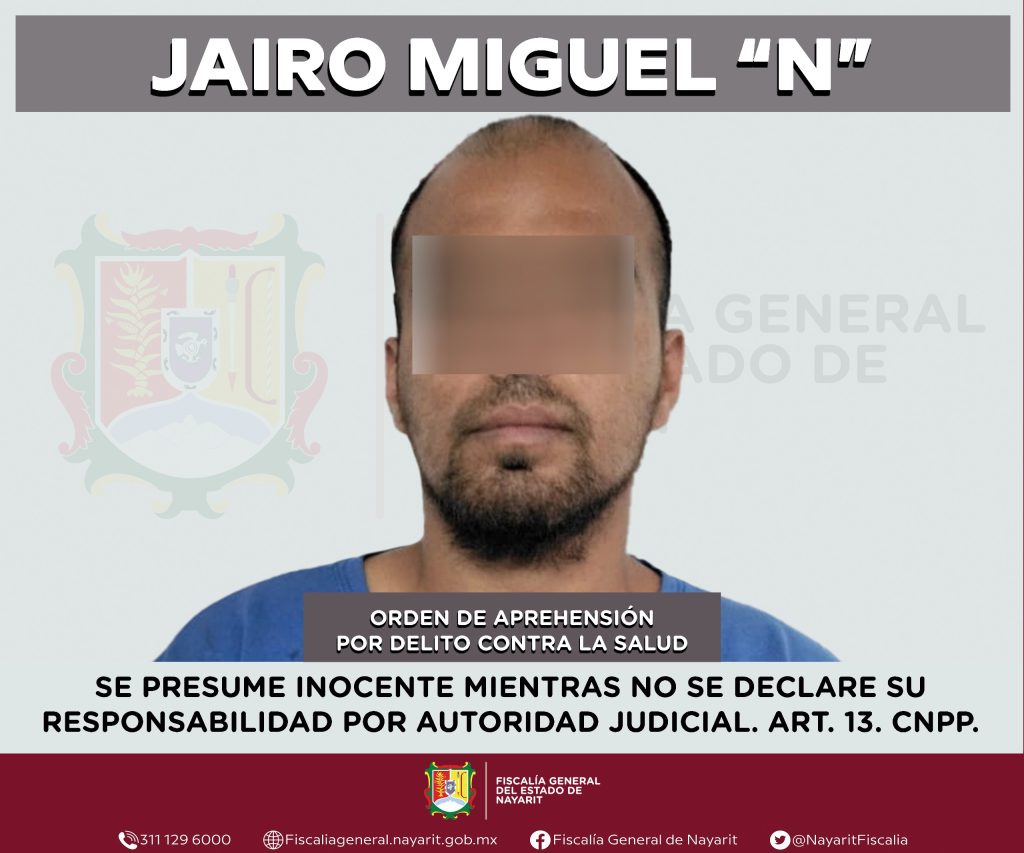 La Fiscalía General del Estado de Nayarit informa que a través de la Agencia de Investigación Criminal de Nayarit ejecutó una orden de aprehensión en la capital nayarita contra Jairo Miguel “N”, por su presunta participación en hechos que para la ley configuran el delito contra la salud en su modalidad de narcomenudeo -en su hipótesis de posesión de psicotrópicos-, en agravio de la sociedad.