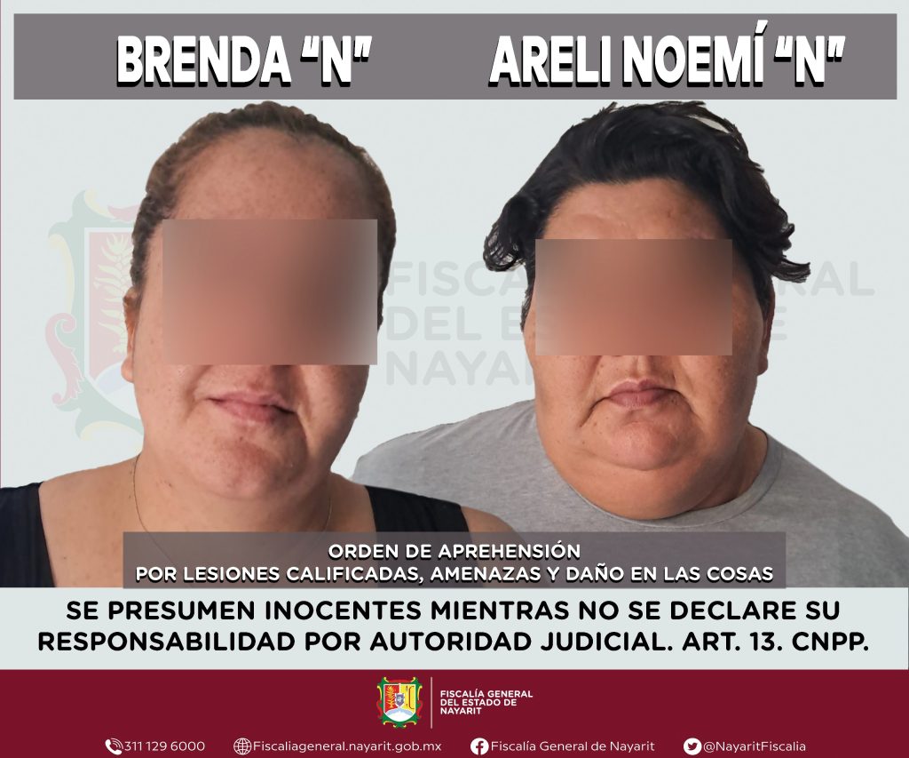 Elementos de la Agencia de Investigación Criminal de Nayarit ejecutaron una orden de aprehensión en el municipio de Bahía de Banderas contra Brenda “N” y Areli Noemí “N”, por su probable participación en hechos que para la ley configuran los delitos de lesiones calificadas, amenazas y daño en las cosas, cometidos en contra de una persona cuya identidad se reserva para salvaguardar su privacidad e integridad.