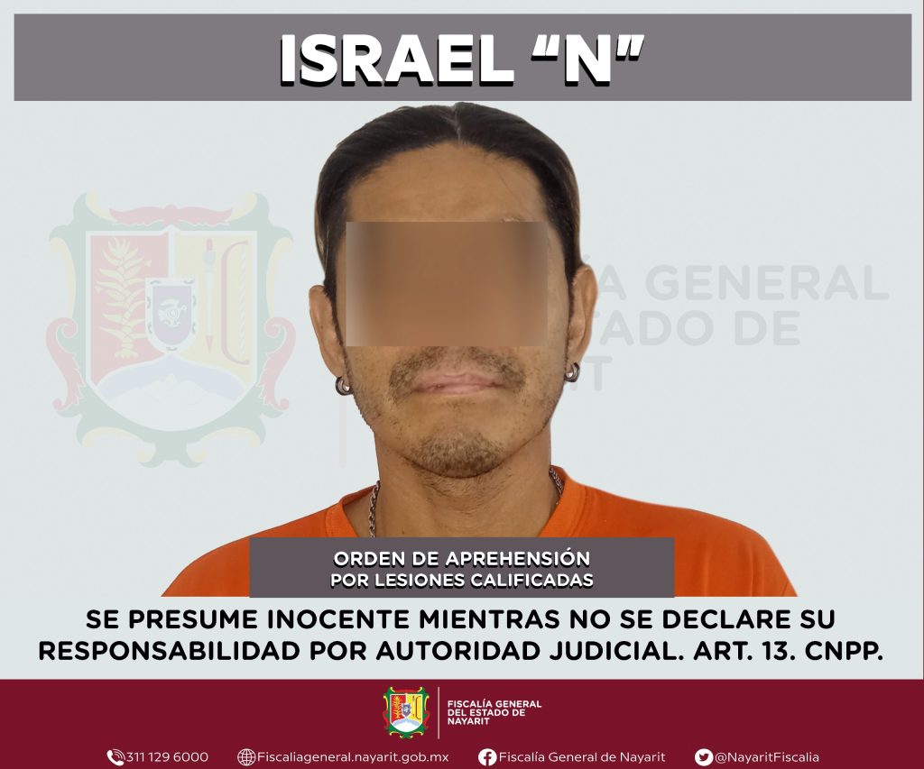 La Fiscalía General de Nayarit informa que a través de la Agencia de Investigación Criminal ejecutó una orden de aprehensión en la localidad Tondoroque, municipio de Bahía de Banderas contra Israel “N”, por su presunta participación en hechos que la ley tipifica como delito de lesiones calificadas, cometido contra dos personas -una de sexo femenino y otra de sexo masculino-, cuyas identidades se reservan con el proposito de salvaguardar su privacidad e integridad.