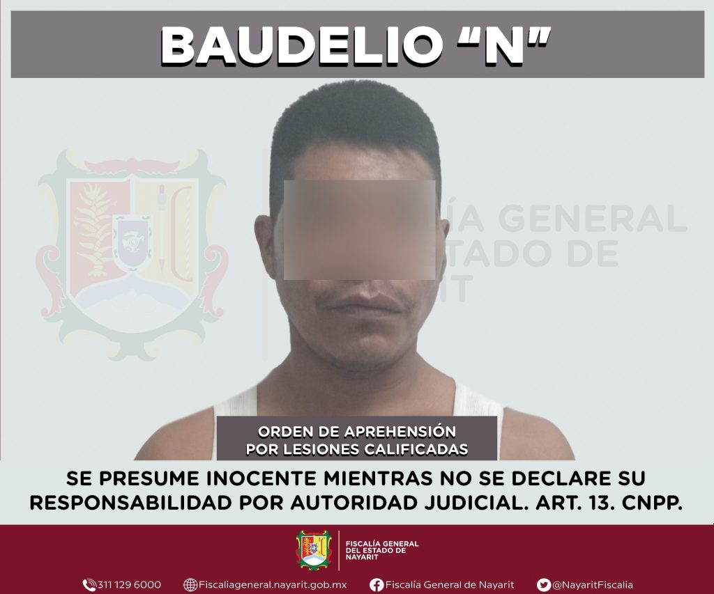 La Fiscalía General de Nayarit a través de la Agencia de Investigación Criminal ejecutó una orden de aprehensión en el municipio Del Nayar contra Baudelio “N”, por su presumible participación en hechos que para la ley configuran el delito de lesiones calificadas, ilícito cometido contra una persona de sexo femenino. La identidad de la ofendida se reserva para salvaguardar su privacidad e integridad.