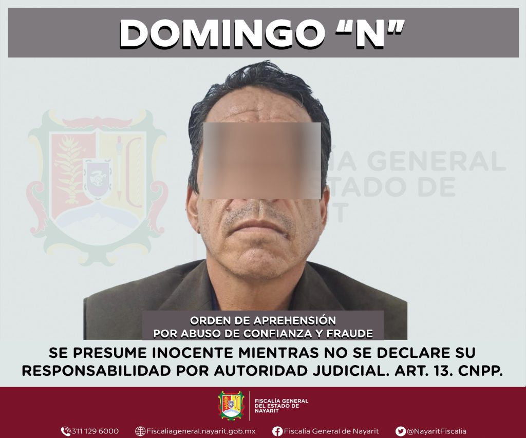 La Fiscalía General de Nayarit a través de la Agencia de Investigación Criminal ejecutó dos órdenes de aprehensión en la capital nayarita contra Domingo “N”, la primera por su presumible participación en hechos que para la ley configuran el delito de fraude, en tanto la segunda es por su probable responsabilidad en el delito de abuso de confianza, ilícitos cometidos en agravio de dos personas de sexo masculino de identidades reservadas.
