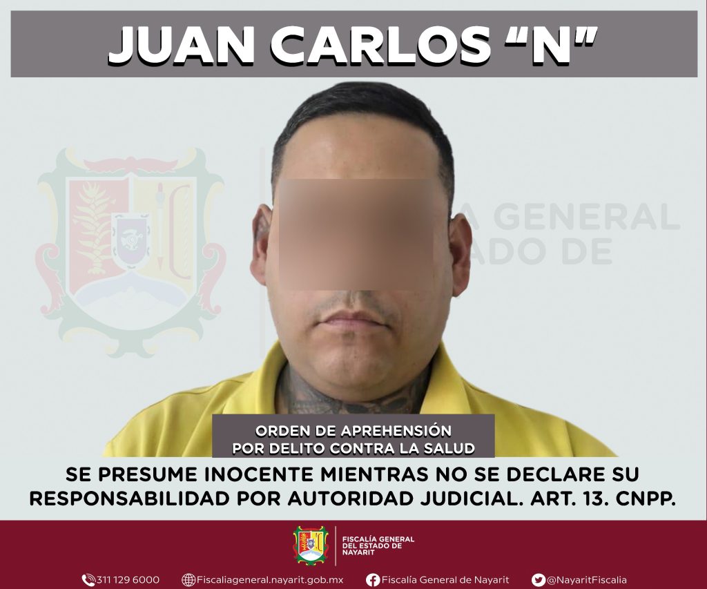 La Fiscalía General del Estado de Nayarit informa que elementos de la Agencia de Investigación Criminal ejecutaron una orden de aprehensión en la capital nayarita contra Juan Carlos “N”, por su presunta participación en hechos que la ley tipifica como delito contra la salud en la modalidad de narcomenudeo -en su hipótesis de posesión de psicotrópicos-, cometido en agravio de la sociedad.