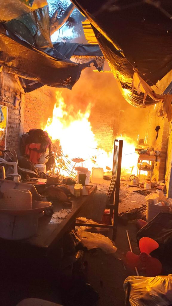 El siniestro se registró en una estructura sólida descubierta de aproximadamente 5 x 10 metros, dividida en cuatro secciones, donde se presentó una combustión desarrollada que involucró materiales combustibles clase A, como línea blanca y prendas de vestir.