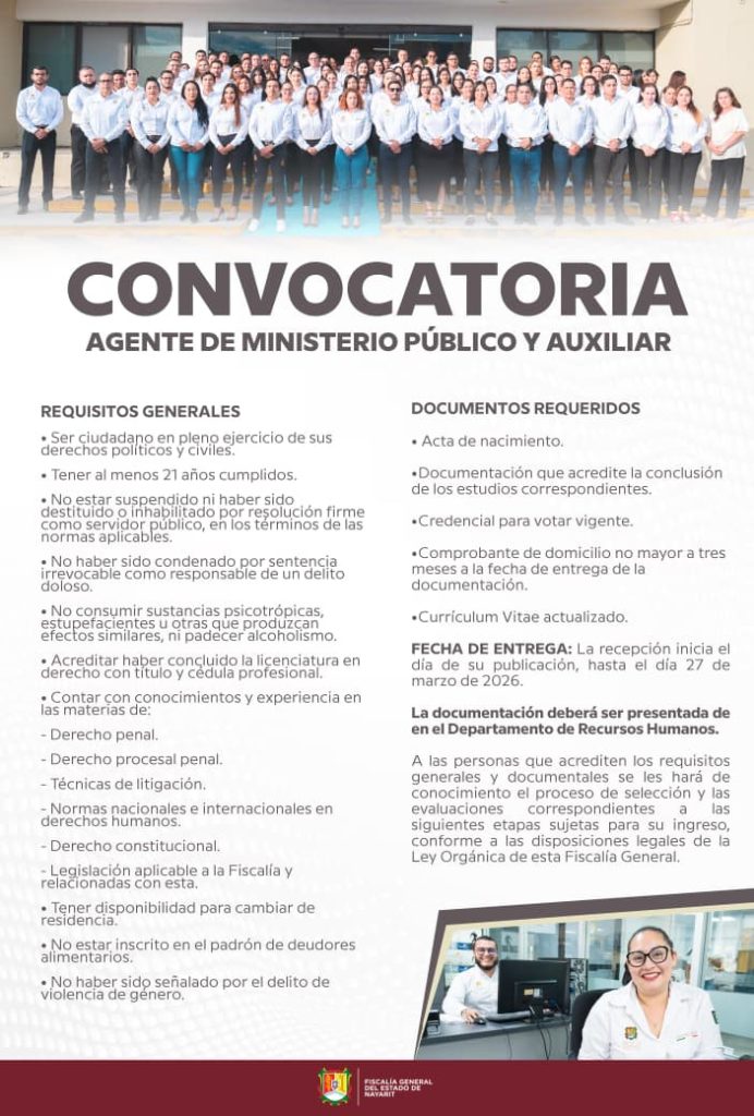 La Fiscalía General del Estado de Nayarit convoca a mujeres y hombres egresados de la carrera en Derecho a participar en el proceso de selección para ocupar cargos como Agentes del Ministerio Público y auxiliares, conforme a las bases establecidas por la institución.