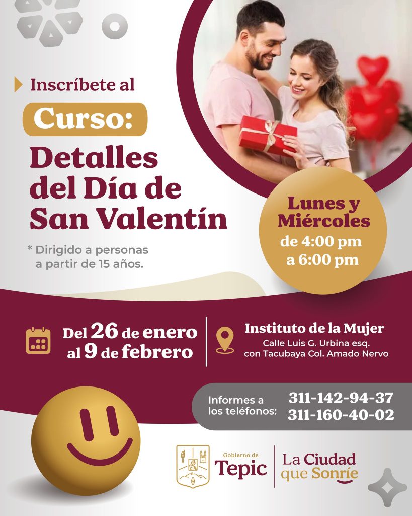 El Gobierno de Tepic, a través del Instituto Municipal de la Mujer, invita al curso “Detalles del Día de San Valentín”, donde aprenderás a elaborar plumas y llaveros decorados, creando detalles únicos para esta temporada.