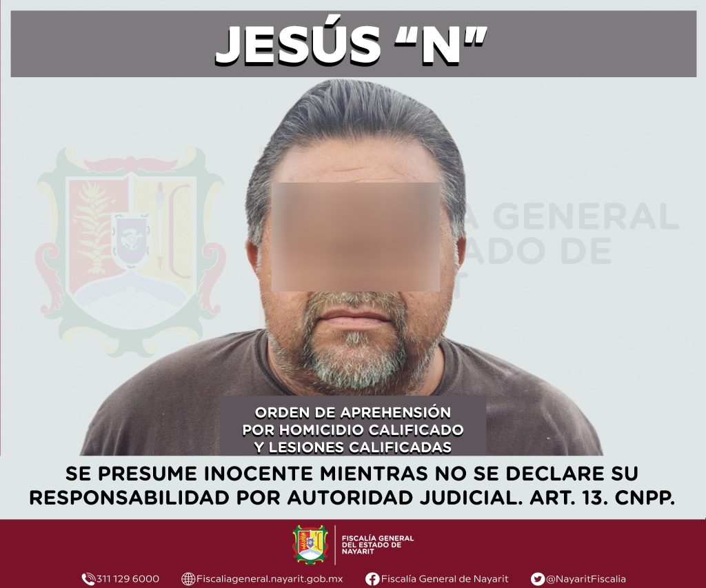 En colaboración con la Fiscalía General del estado de Jalisco, elementos de la Agencia de Investigación Criminal de Nayarit ejecutaron una orden de aprehensión en la ciudad de Tepic contra Jesús “N”, por su probable participación en hechos que para la ley configuran los delitos de homicidio calificado y lesiones calificadas, cometidos en la ciudad de Guadalajara, Jalisco. El primer delito en agravio de una persona de sexo masculino, mientras el segundo en contra de otra persona de sexo masculino. Las identidades de las víctimas se reservan para salvaguardar su privacidad.