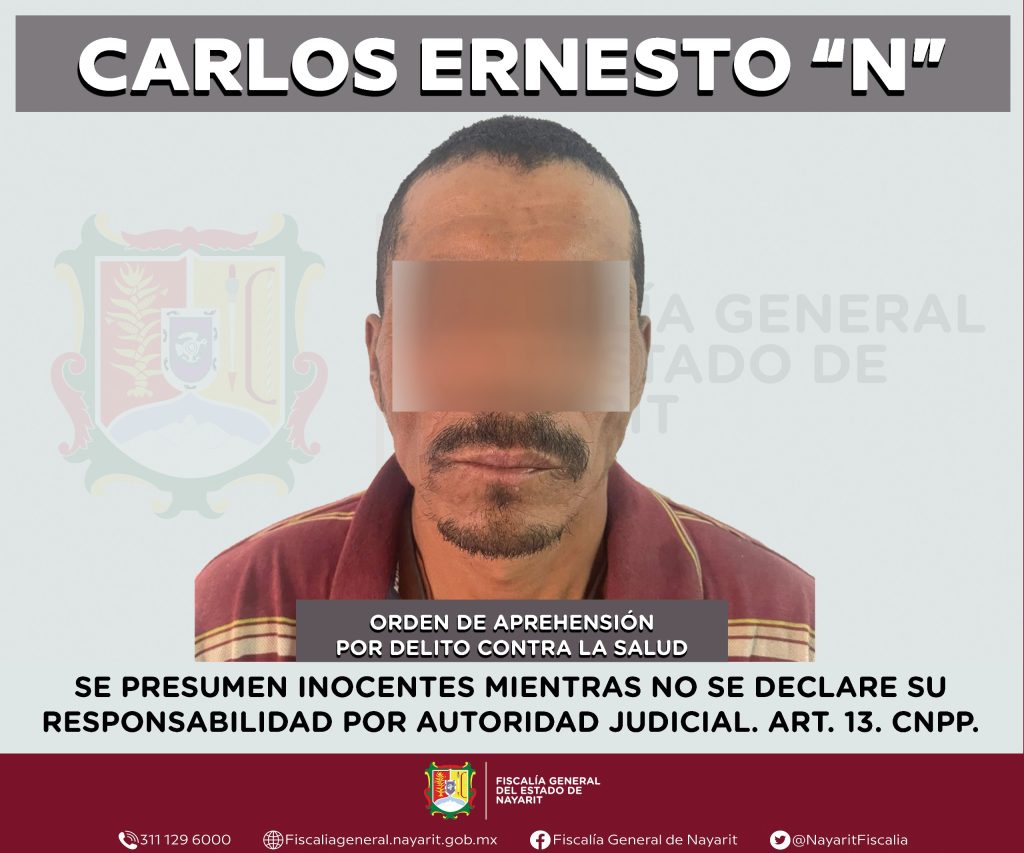 La Fiscalía General del Estado de Nayarit informa que a través de la Agencia de Investigación Criminal de Nayarit ejecutó una orden de aprehensión en la ciudad de Tepic contra Carlos Ernesto “N”, por su presunta participación en hechos que la ley tipifica como delito contra la salud en su modalidad de narcomenudeo -en la hipótesis de posesión de psicotrópicos-, en agravio de la sociedad.