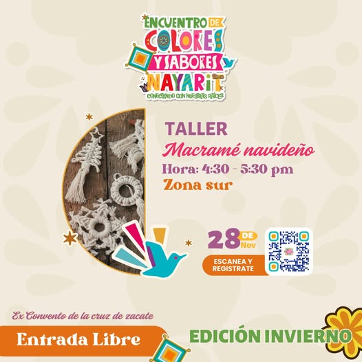 Este 28 de noviembre vive una experiencia única en la explanada del Ex Convento de la Cruz con nuestro Taller de Macramé Navideño, donde podrás aprender técnicas creativas para elaborar piezas decorativas llenas de encanto.