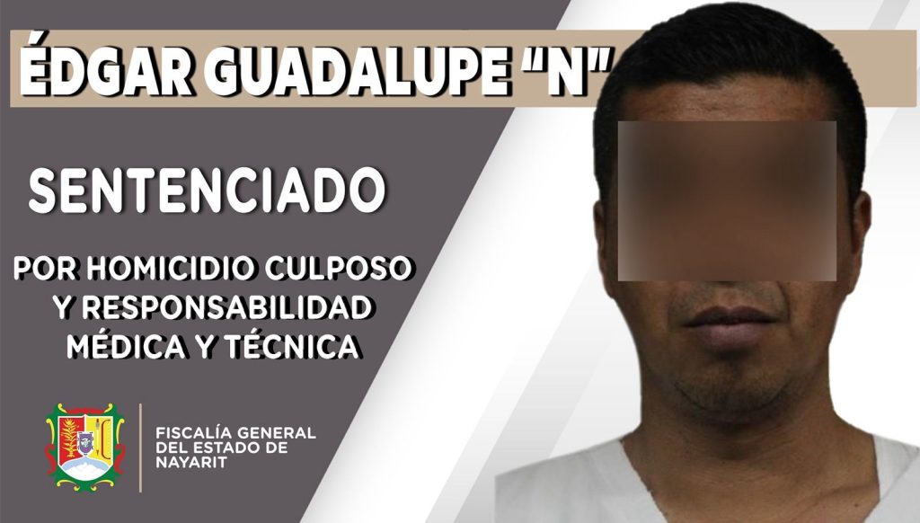 Tepic, Nayarit; 18 de abril de 2026. – Fiscalía General del Estado de Nayarit obtuvo, en audiencia de juicio oral, fallo condenatorio por 4 años y 6 meses contra Edgar Guadalupe “N” por los delitos de homicidio culposo y responsabilidad médica y técnica, en agravio de un recién nacido y de su madre, cuya identidad se reserva para proteger su integridad y privacidad.