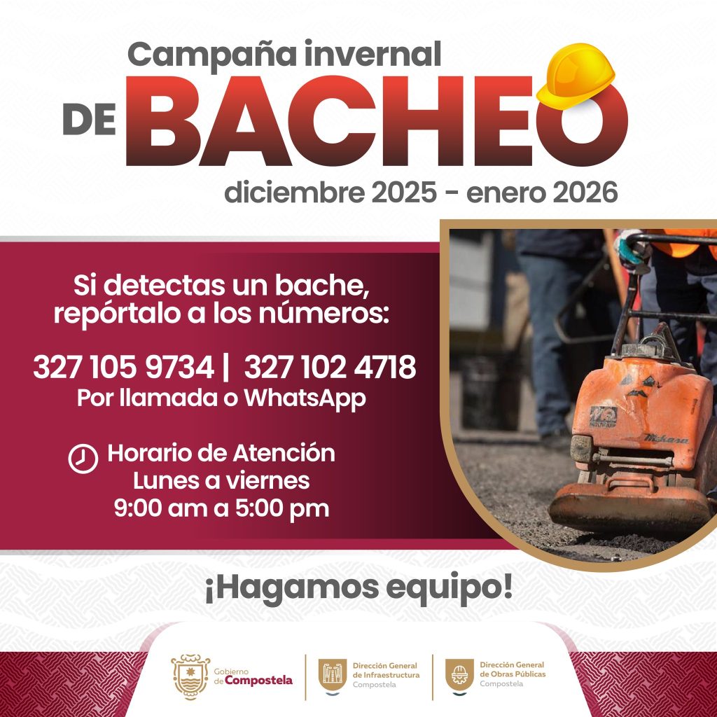 El Gobierno de Compostela, en coordinación con la Dirección de Infraestructura, mantiene activa durante los meses de diciembre de 2025 y enero de 2026 la campaña de bacheo invernal, con el objetivo de mejorar la seguridad vial y las condiciones de las calles del municipio.