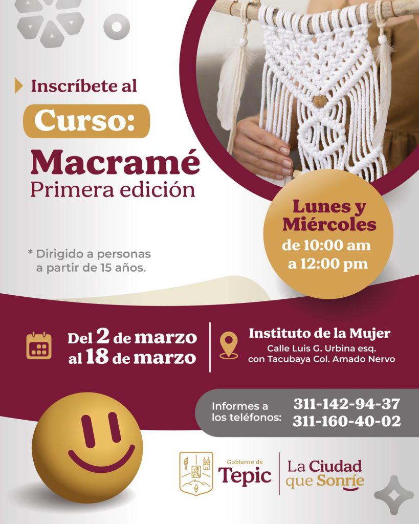 El Gobierno de Tepic y el Instituto Municipal de la Mujer te invitan al curso de Macramé, dirigido a personas mayores de 15 años. ![]()