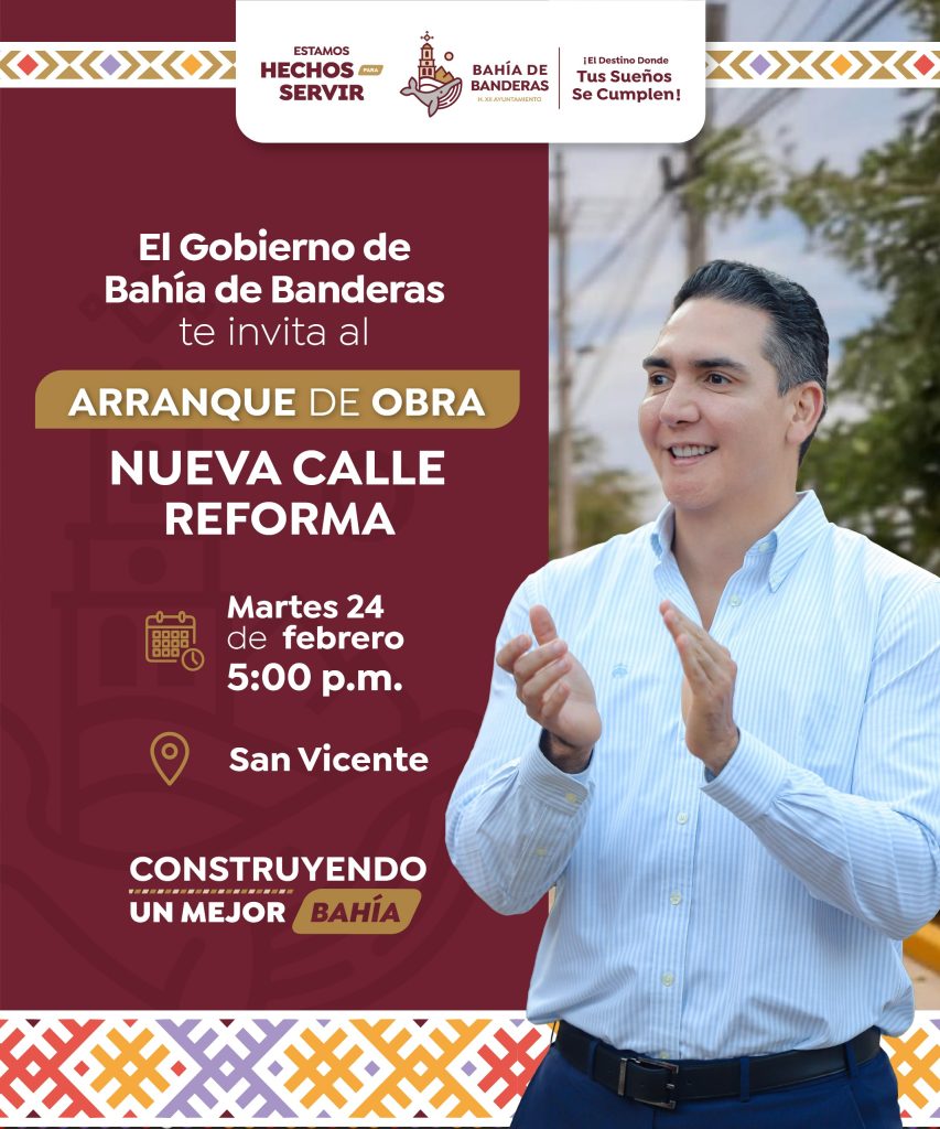 El Gobierno de Bahía de Banderas, que encabeza el presidente municipal Héctor Santana, invita a la ciudadanía al arranque de obra de la nueva calle Reforma, que se realizará este martes 24 de febrero en. punto de las 5:00 p.m., en el poblado de San Vicente.