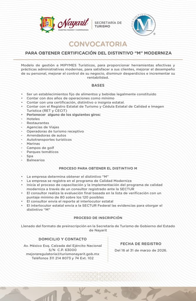La Secretaría de Turismo del Estado de Nayarit invita a las empresas del sector turístico a participar en la Convocatoria para obtener la Certificación del Distintivo “M” Moderniza, un programa que impulsa la profesionalización, competitividad y calidad en los servicios turísticos.