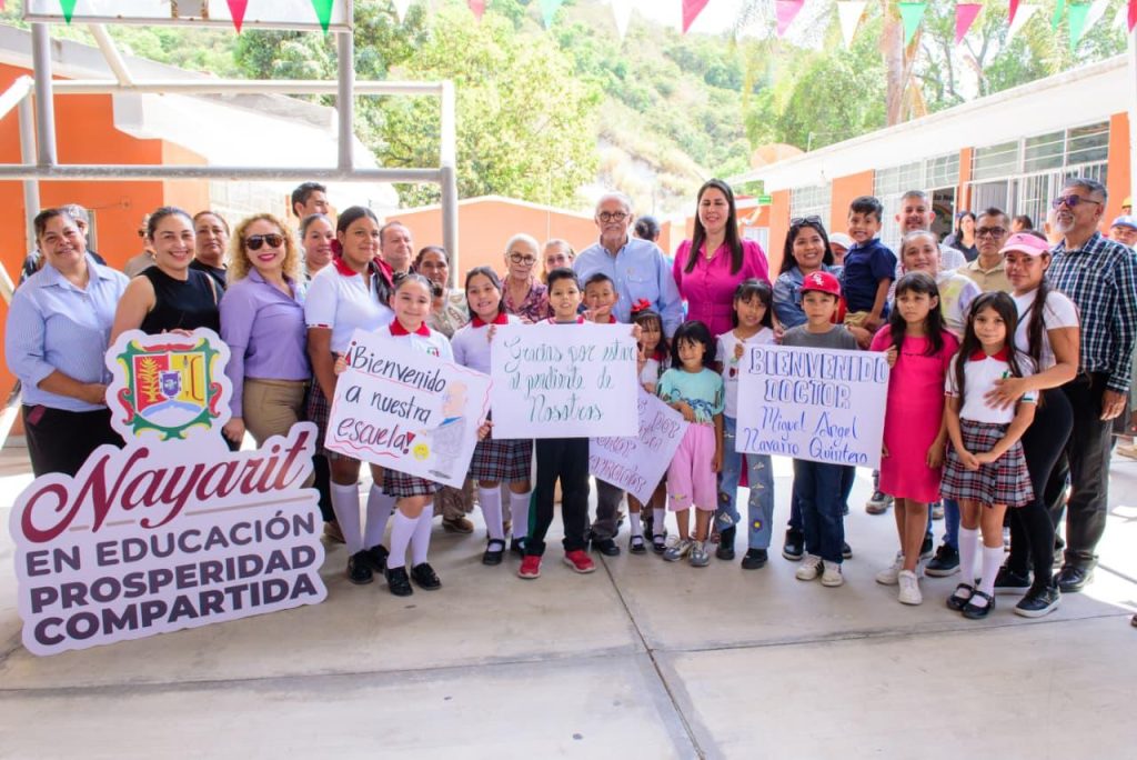 El gobernador del estado, Miguel Ángel Navarro Quintero, junto a su esposa, la doctora Beatriz Estrada Martínez, presidenta del Sistema DIF Nayarit, puso en marcha en la Primaria 24 de Febrero, en Tepic, obras de rehabilitación de servicios sanitarios, mejora de la instalación eléctrica, construcción de rampas, así como un desayunador y un domo para fortalecer las condiciones en las que estudian las niñas y los niños.