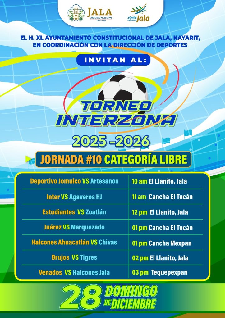 El H. XL Ayuntamiento de Jala, en coordinación con la Dirección de Deportes, invita a toda la afición a disfrutar de la Jornada 10, categoría libre, este domingo 28 de diciembre.