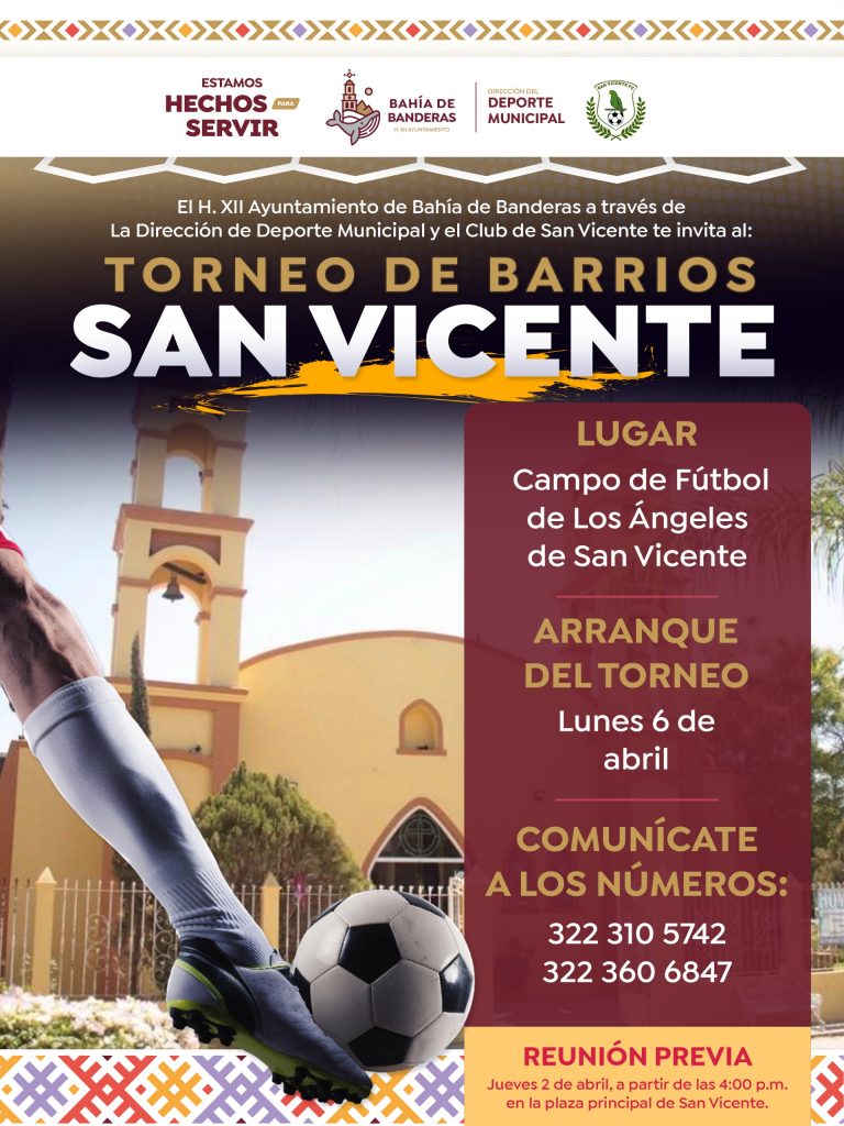 El Gobierno Municipal de Bahía de Banderas, a través de la Dirección del Deporte Municipal, lanzó la convocatoria para participar en el “Torneo de Barrios San Vicente”, una iniciativa que busca fomentar la convivencia, el deporte.