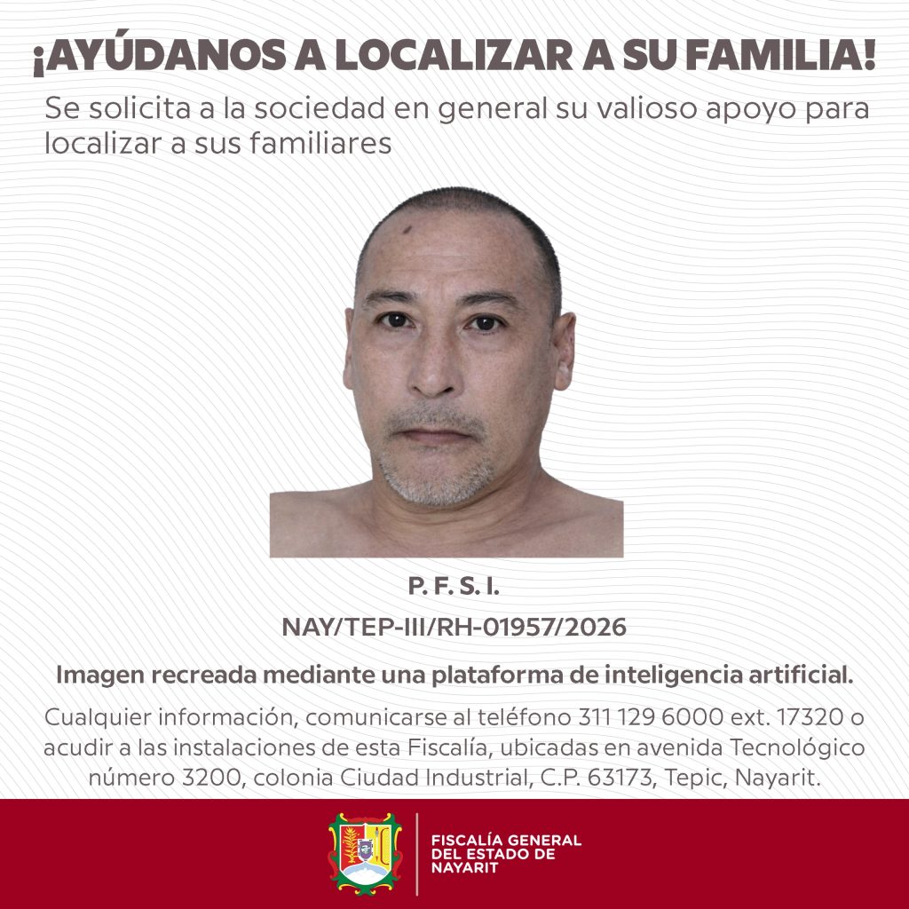 La Fiscalía General del Estado de Nayarit solicita el apoyo de la ciudadanía para lograr su identificación. Su cuerpo se encuentra resguardado en el Servicio Médico Forense, ubicado en Av. Tecnológico No. 3200 Oriente, colonia Ciudad Industrial, en Tepic.