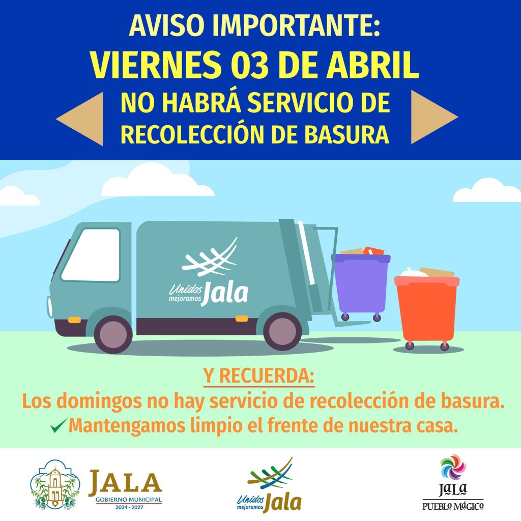 Les recordamos que el camión recolector de basura estará pasando únicamente los días JUEVES y SÁBADO, por lo que se les solicita NO SACAR LA BASURA los días viernes y domingo.