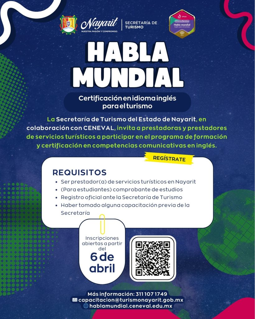 La Secretaría de Turismo del Estado de Nayarit, en conjunto con el CENEVAL, convoca a las y los prestadores de servicios turísticos, así como a estudiantes próximos a egresar, a participar en el programa de formación y certificación de competencias comunicativas en idioma inglés: «Habla Mundial».