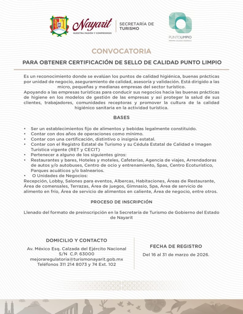 La Secretaría de Turismo del Estado de Nayarit lanza la Convocatoria para obtener la Certificación del Sello de Calidad Punto Limpio, un reconocimiento que distingue a las empresas turísticas que aplican altos estándares de higiene, buenas prácticas y calidad en sus servicios.