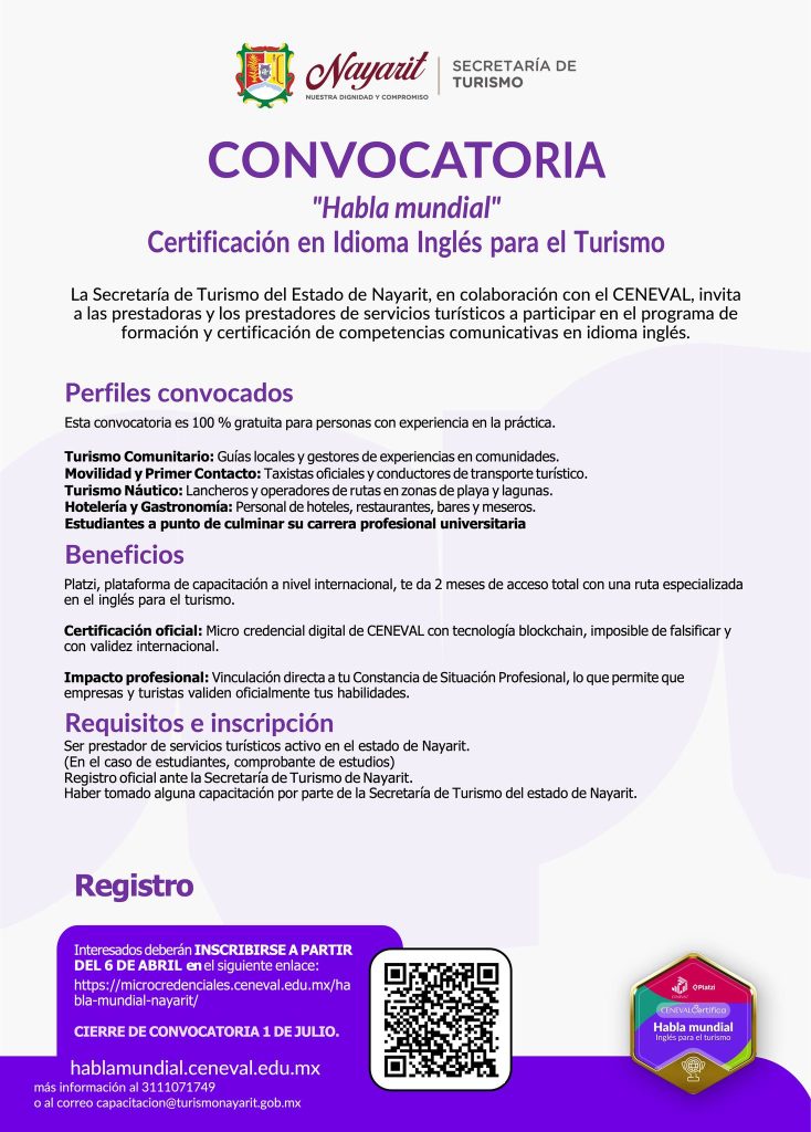 La Secretaría de Turismo del Estado de Nayarit, en conjunto con el CENEVAL, convoca a las y los prestadores de servicios turísticos, así como a estudiantes próximos a egresar, a participar en el programa de formación y certificación de competencias comunicativas en idioma inglés: «Habla Mundial».