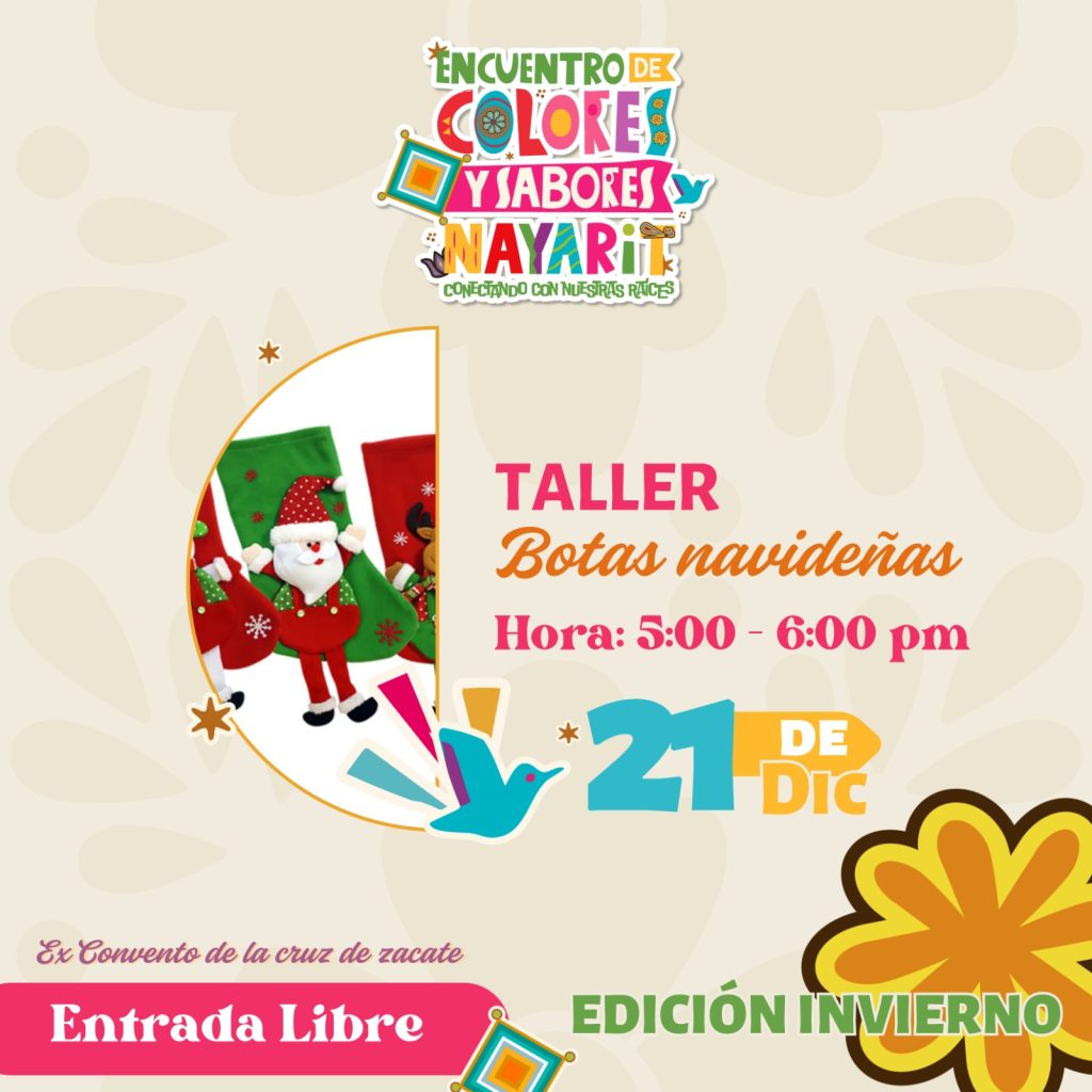 Este domingo 21 de diciembre, de 5:00 a 6:00 pm, acompáñanos al Taller de Botas Navideñas en el Festival de Colores y Sabores, Exconvento de la Cruz, Tepic. ¡Un detalle perfecto para decorar tu hogar!