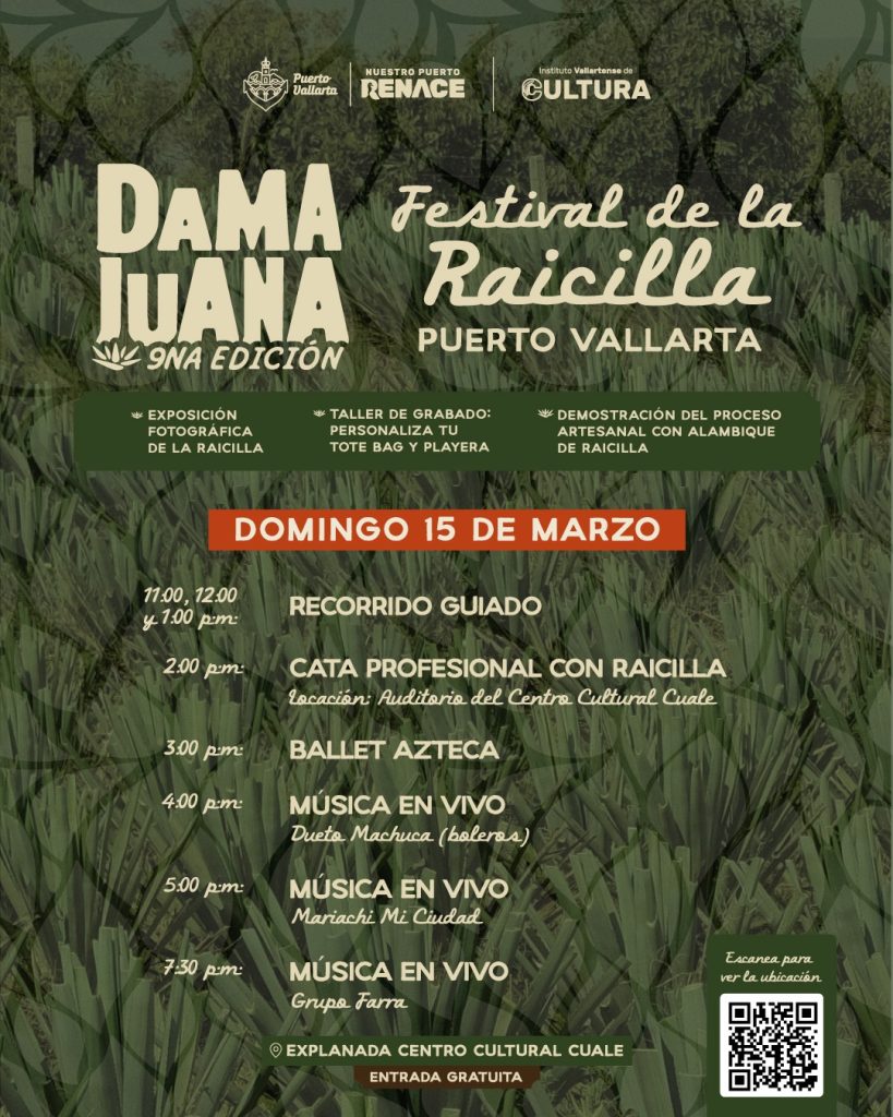 Puerto Vallarta se prepara para un fin de semana lleno de tradición, cultura y música con la celebración de la 9ª edición del Festival de la Raicilla Dama Juana, impulsado por el gobierno del arquitecto Luis Ernesto Munguía González, a través del Instituto Vallartense de Cultura, que se llevará a cabo del 13 al 15 de marzo en la explanada del Centro Cultural Cuale, con entrada gratuita para toda la familia.