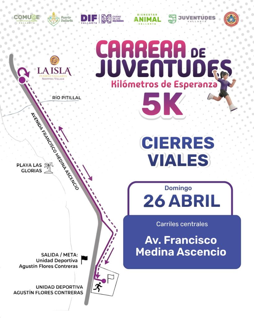 La ruta de esta carrera dará inicio desde la Unidad deportiva Agustín Flores Contreras, sobre la avenida Francisco Medina Ascencio, recorriendo una distancia de 5 kilómetros para retornar en el “crucero de la Isla” esquina con Av. Fluvial Vallarta. Por lo que se pide tomar precauciones y utilizar rutas alternas.