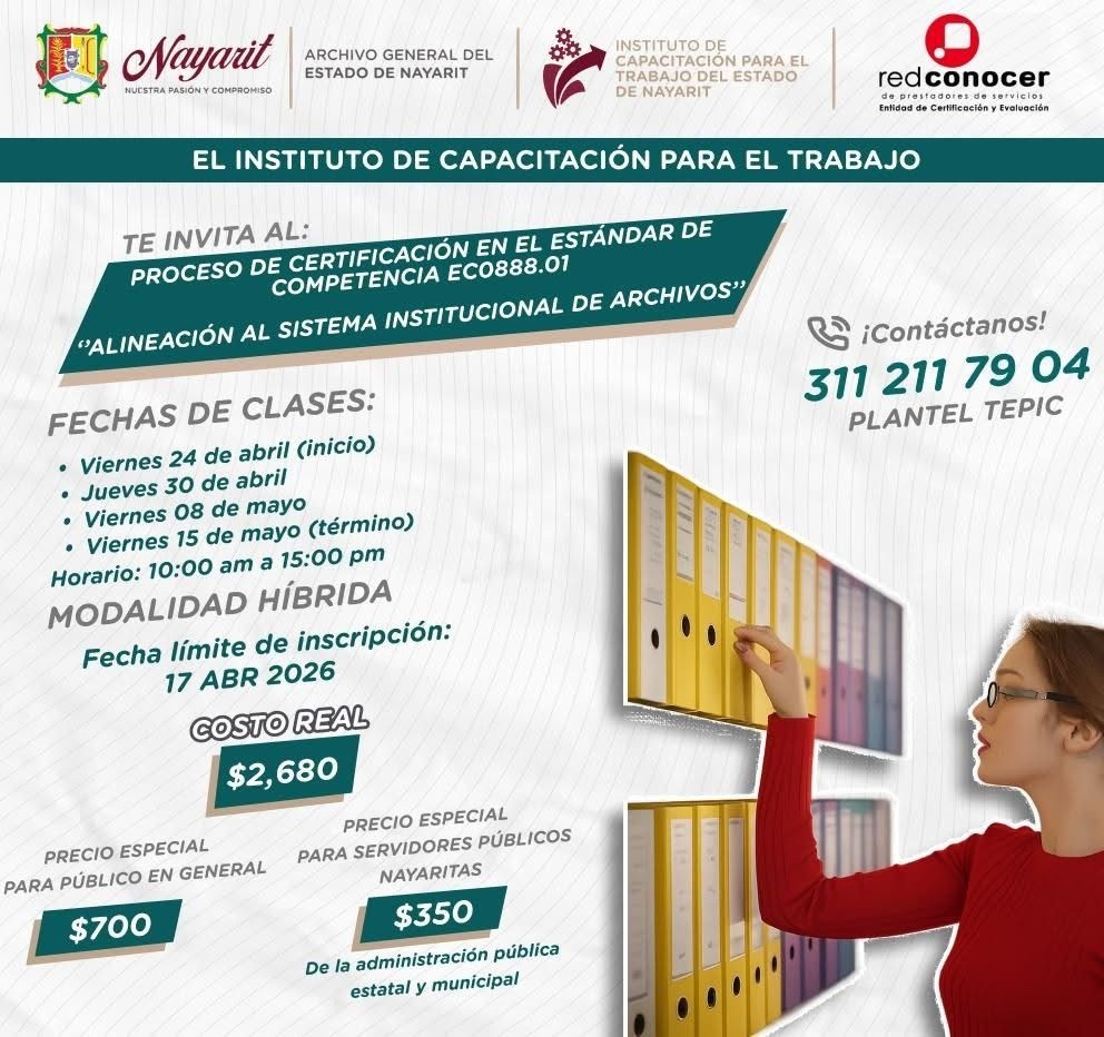 El Gobierno del Estado de Nayarit, a través del ICATEN, invita a participar en el Proceso de Certificación en el Estándar de Competencia EC0888.01: Alineación al Sistema Institucional de Archivo, dirigido a quienes buscan fortalecer sus conocimientos en organización, control y gestión documental con validez oficial.