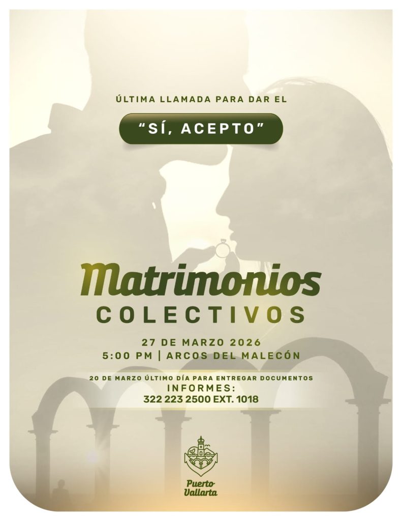 El Gobierno Municipal de Puerto Vallarta invita a las parejas a aprovechar los últimos días de registro para participar en la Campaña de Matrimonios Colectivos 2026, una celebración que tendrá como escenario Los Arcos del Malecón, donde las parejas podrán unir sus vidas el próximo 27 de marzo.