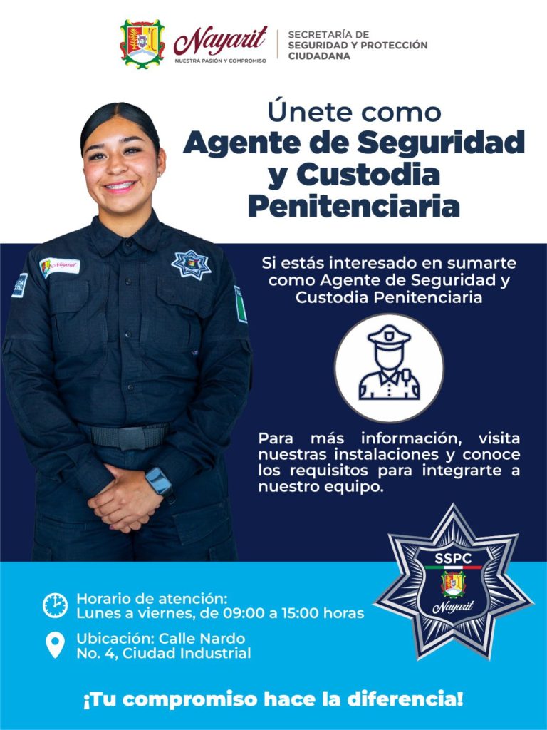 El Gobierno del Estado de Nayarit, a través de la Secretaría de Seguridad y Protección Ciudadana, te invita a formar parte del proceso de reclutamiento para ser Agente de Seguridad y Custodia Penitenciaria.