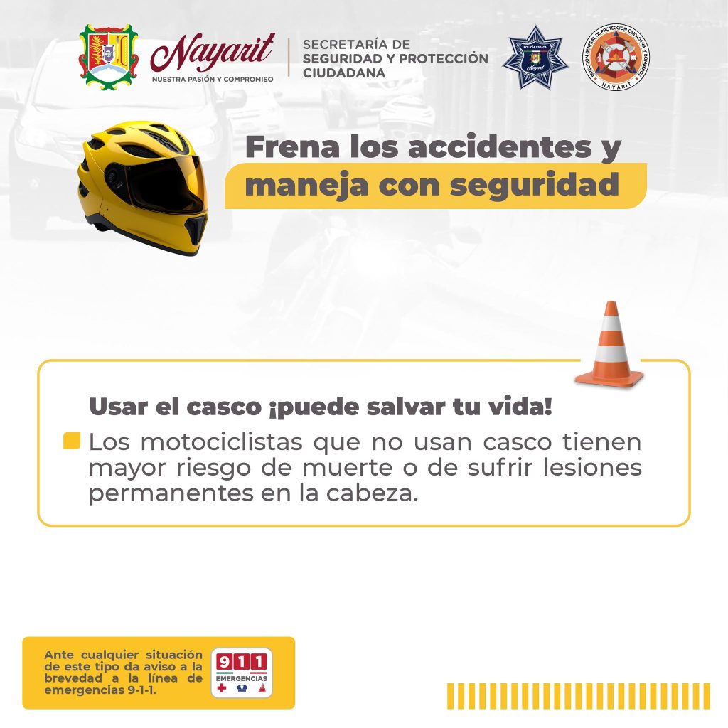 El uso de casco es obligatorio. Revisa que tu casco cumpla con las regulaciones similares o mayores a la Norma Oficial Mexicana. Úsalo siempre abrochado. Verifica el tiempo promedio de vida y reemplázalo cuando tenga una colisión por mínima que ésta haya sido.