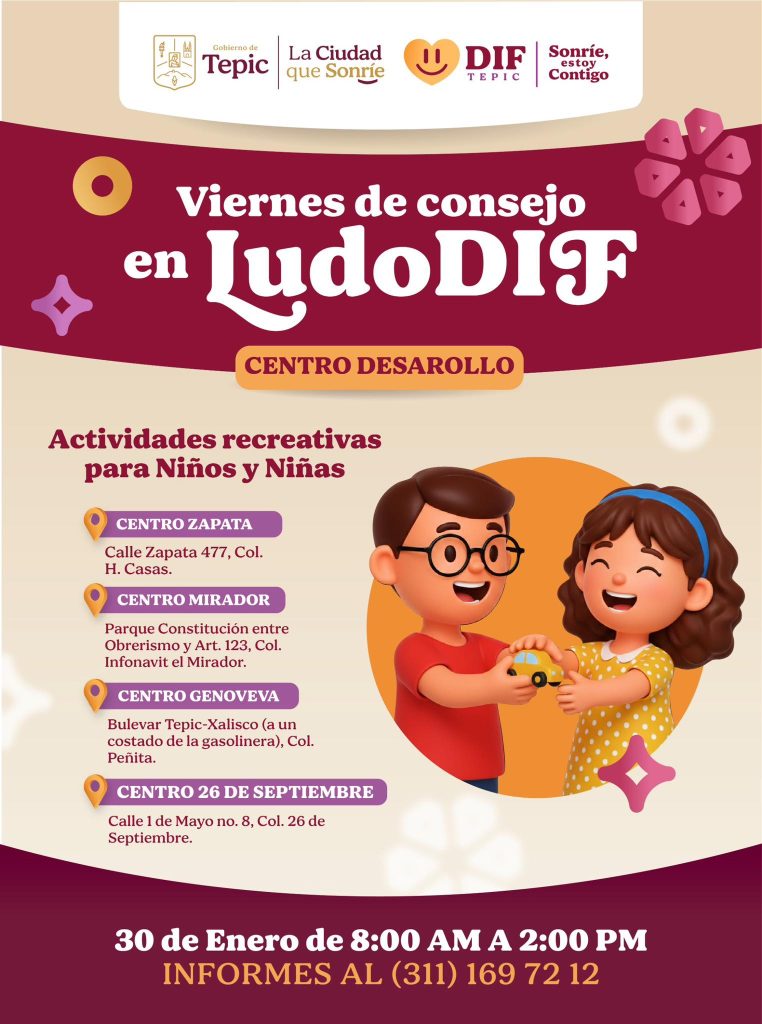 El DIF Tepic te invita a participar este viernes 30 de enero en una jornada llena de aprendizaje, diversión y sana convivencia en nuestros Centros de Desarrollo, con actividades recreativas dirigidas a niñas y niños.