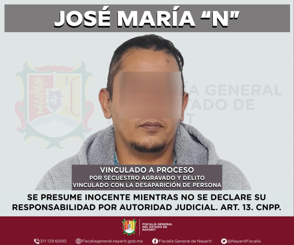 La Fiscalía General del Estado de Nayarit informa que José María “N” fue vinculado a proceso por su probable responsabilidad en los delitos de secuestro agravado y delito vinculado con la desaparición de persona, cometidos en agravio de una persona del sexo masculino.